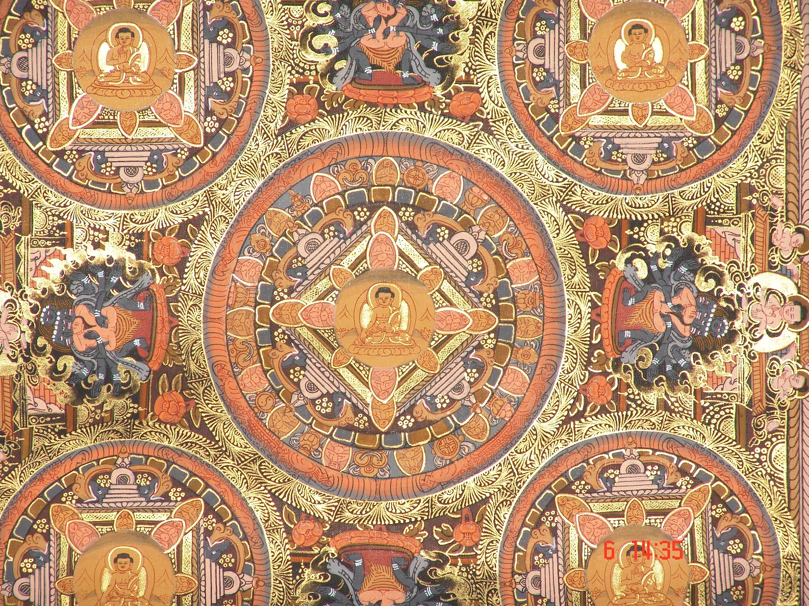 Mandala is a circle which is a device for the Tantric meditation. It is a visual aid for concentration and introversive meditation leading to the attainment of insights and to activation of forces culminating in "Siddhi" supernatural forces. The Mandala is the graphic representation of this process. It is not only theoretical but practical also as an operational scheme involving a clear plan for practical realization of the process within oneself. It thus becomes an instrument (Yantra). There are many types and varieties of Mandalas depending on the nature of the central deity. The most classic pattern of Mandalas is of the Dhyani Buddha. This Thangka depicts Buddha Mandala. The Mandala represents "palace of purity" a magic sphere cleared of spiritual obstacles and unpurified. The square of the "Sacred palace" proper is end used in multiple circles of flame, Vajra, eight centuries (appears only in wrathful deities) lotus, then the inner square to reach to the deity of the Mandala.
